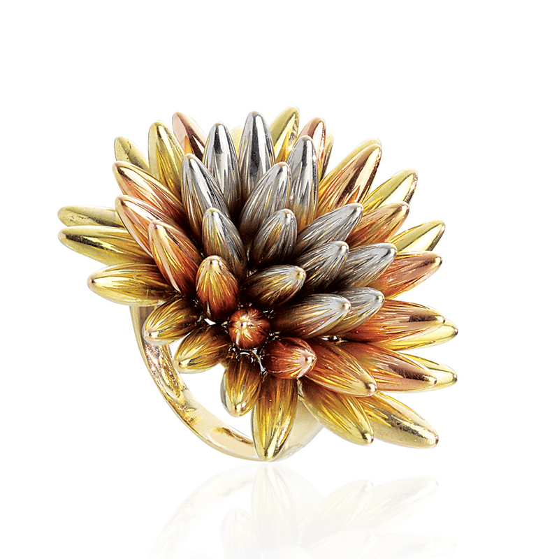 PRSTEN, ARTLINEA Vatromet, 2000. Prsten od 18 kt žutog, bijelog i ružičastog zlata; elektroformiranje, mikrofuzija, lasersko zavarivanje