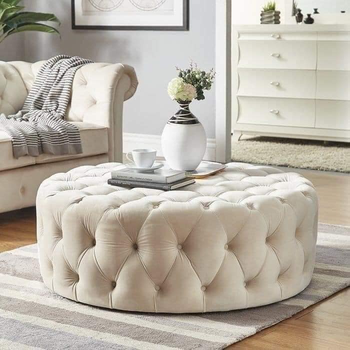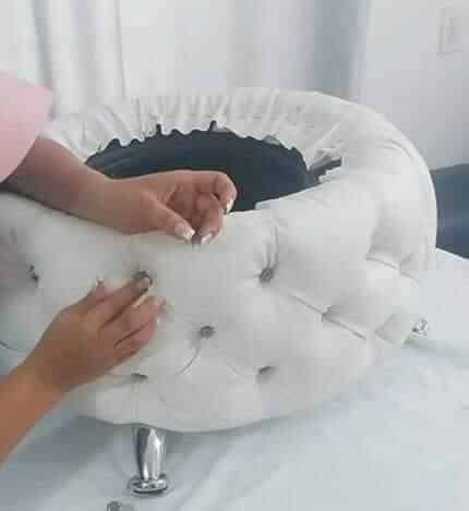 Na prvi pogled izgleda komplicirano, ali nije. Gumu operite i posušite. oko nje stavite tkaninu koja odgovara vašem prostoru. Pričvrstite ju čavlićima i “šerafima” za gumu. Na “šerafe” silikonskim ljepilom zalijepite ukrasne gumbe.