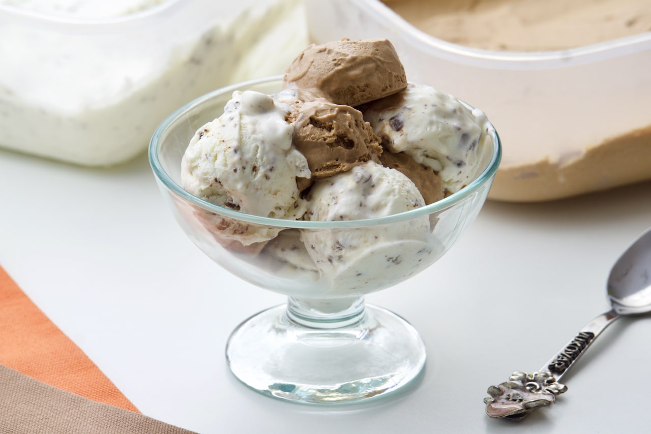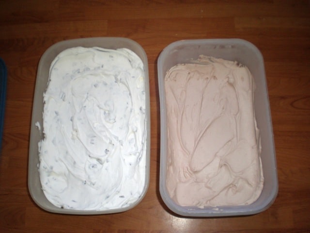 - U svaki dio po želji dodati ili nasjeckanu čokoladu, ili otopljenu čokoladu ili voće, pospremiti ga u zatvorene plastične kutije i zamrznuti.