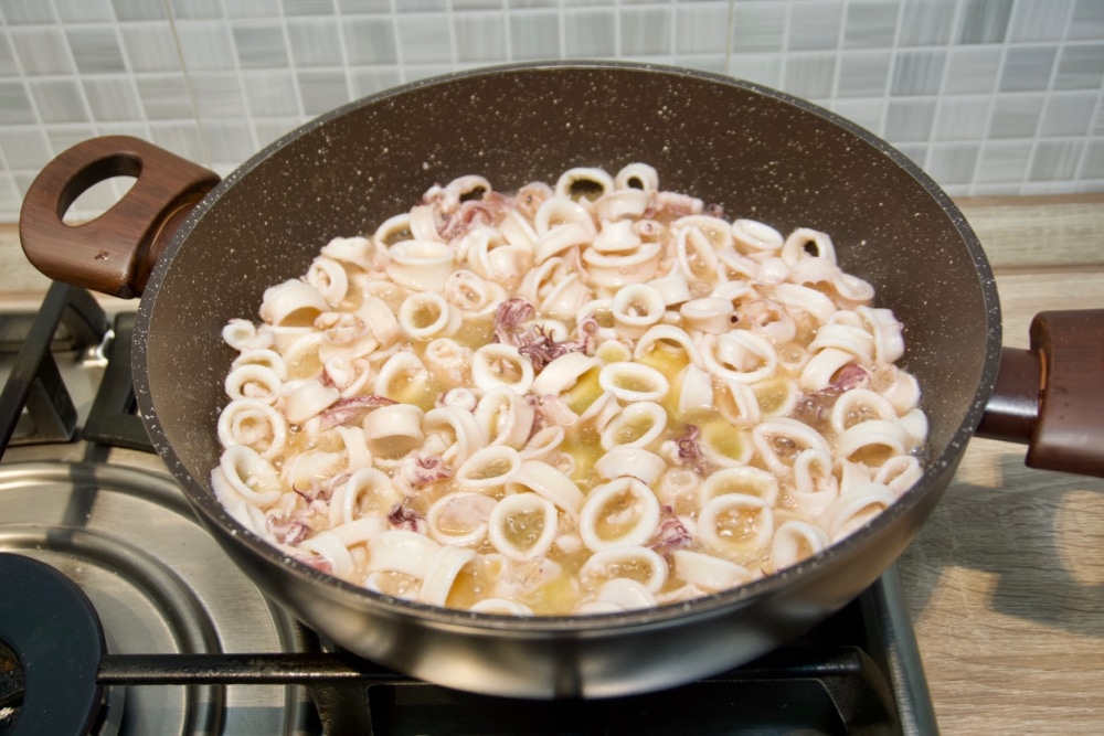 1. Očišćene lignje narezati na kolutiće, pa ih zajedno sa krakovima ispržiti na malo maslinovog ulja. Pržiti 5-6 minuta.