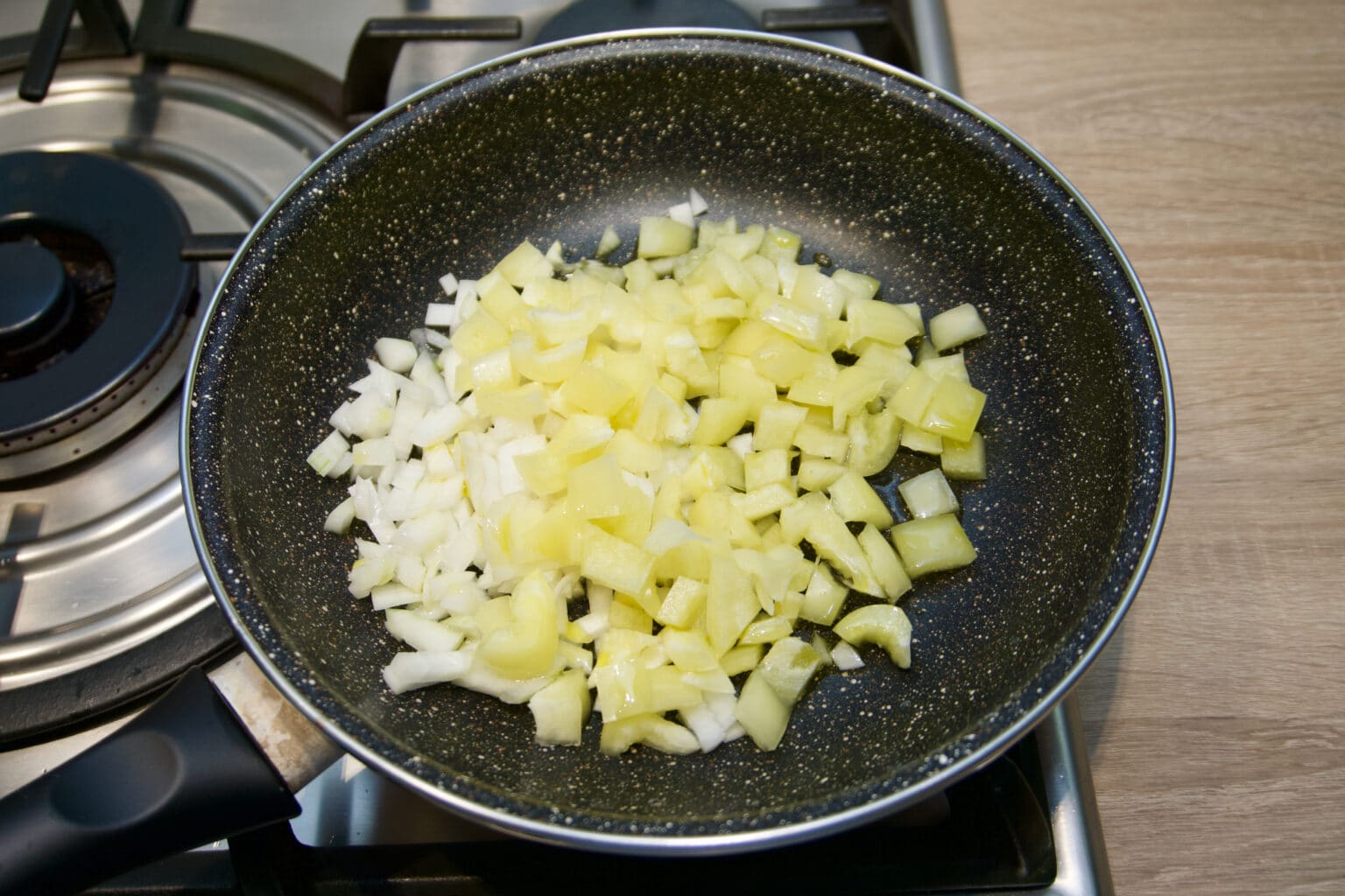 - Prije svega patlidžan oguliti i nasjeći na ploške. Svaku plošku dobro posoliti i ostaviti da odstoji 15-tak minuta kako bi se oslobodila gorčina. Nakon toga patlidžan obrisati ubrusom i nasjeći na male kockice.