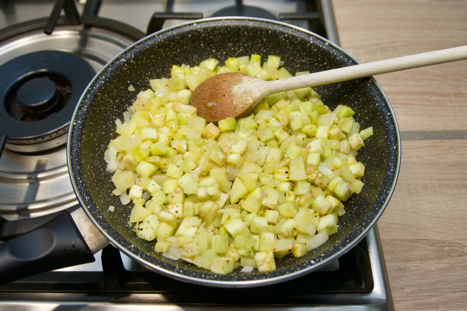 - Za nadjev pržiti na malo ulja sitno sjeckani luk i papriku. Kada luk i paprika povenu dodati patlidžan. Pržiti uz miješanje par minuta, dodati začine i rajčicu. Pržiti sve u vlastitom soku bez dodavanja tekućine 10-tak minuta. U gotovi nadjev dodati obje vrste sira i dobro sve promiješati.