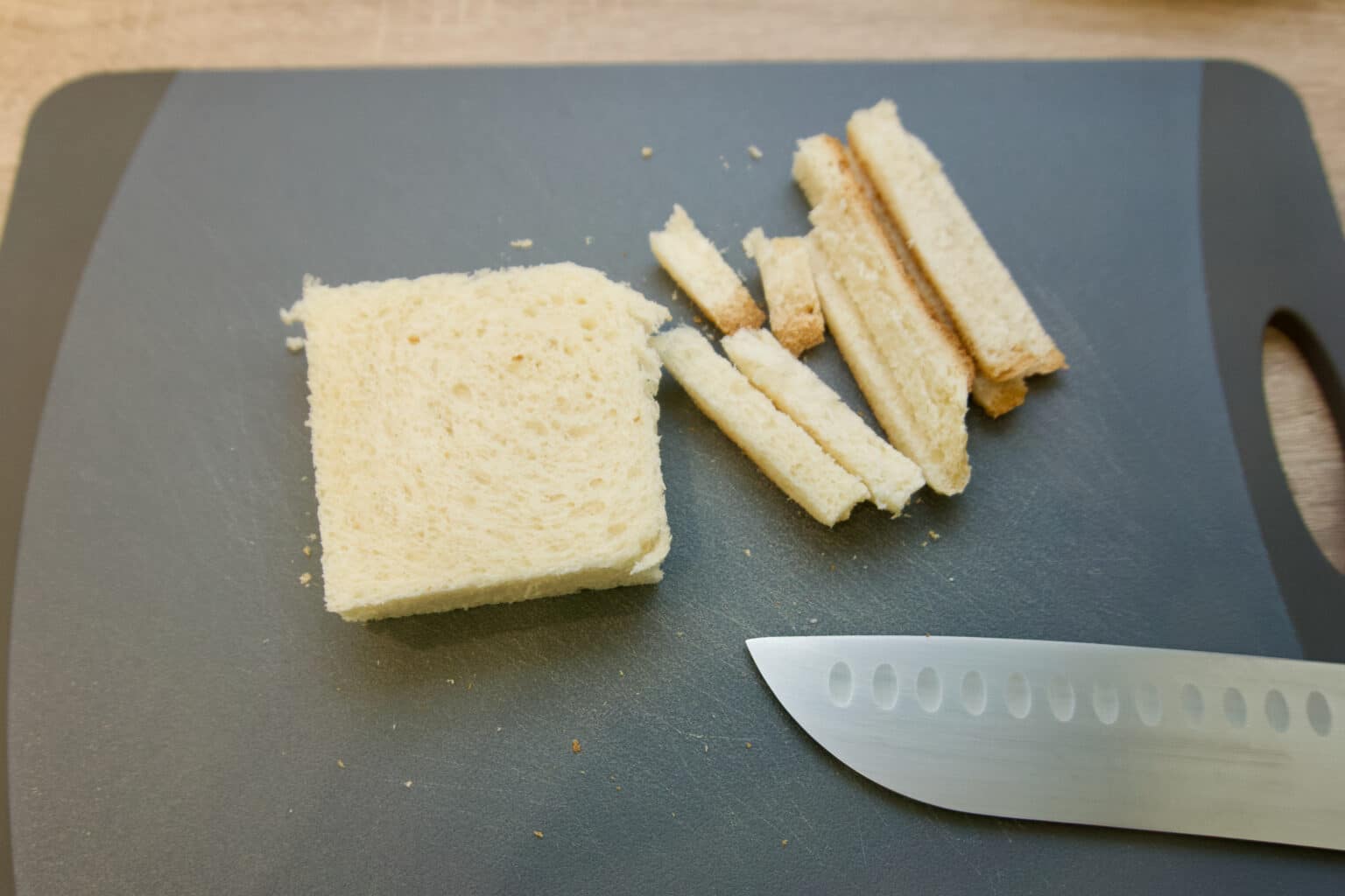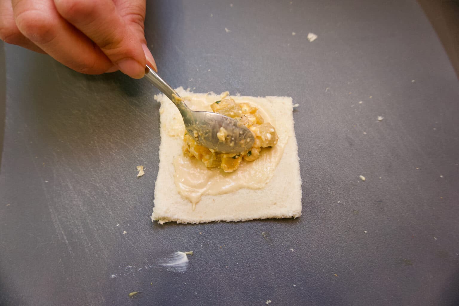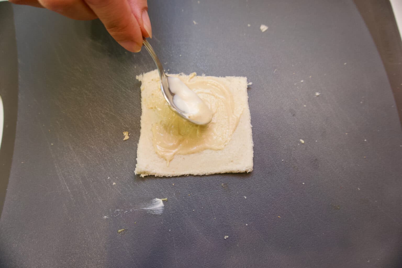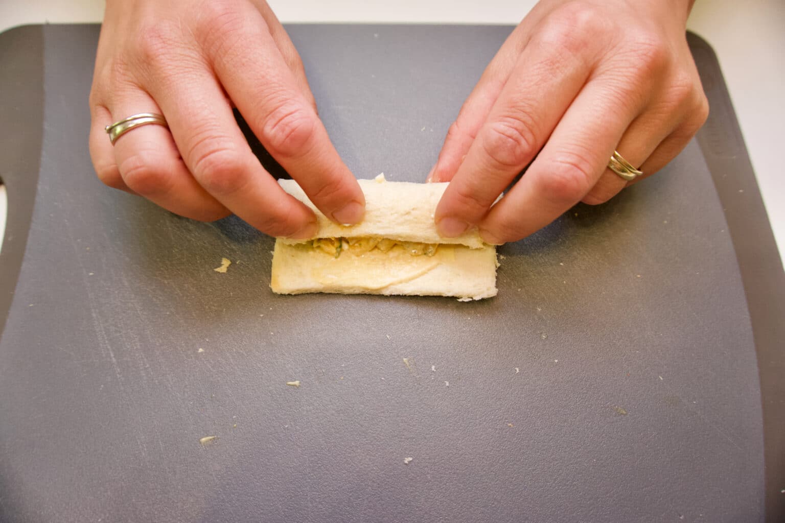 - Svaku šnitu tosta utanjiti što više valjkom za tijesto kako bi šnita postala žilava i podatna za savijanje.