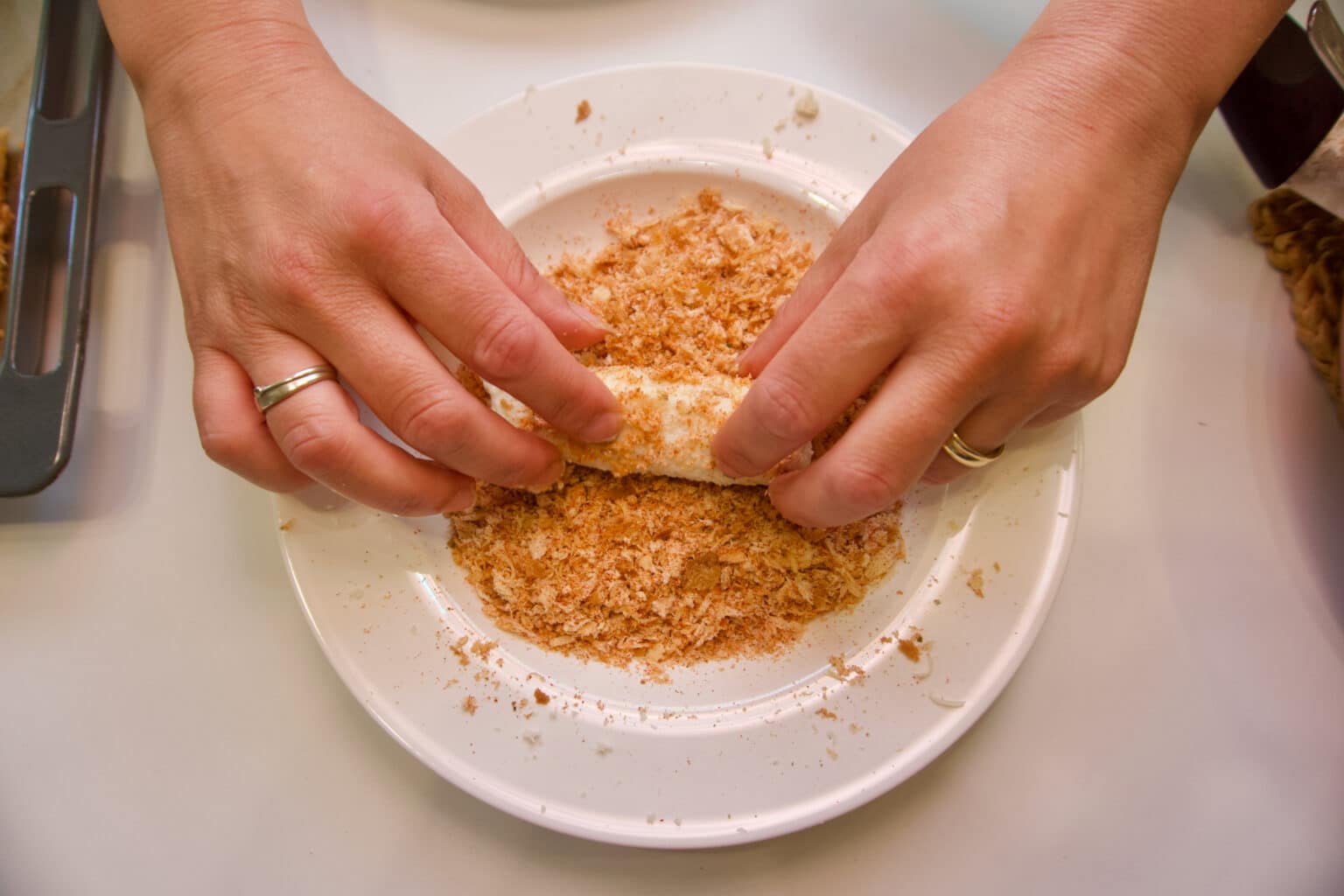 - Svaku šnitu premazati senfom, staviti nadjev na rub i saviti u rolicu. Najbrže je kada napravite dvije do tri rolice jednu za drugom. Svaku rolicu kratko i pažljivo umočiti u mlijeko i odmah potom u pripremljene mrvice. Tako načinjene rolice odlagati u lim obložen papirom za pečenje.