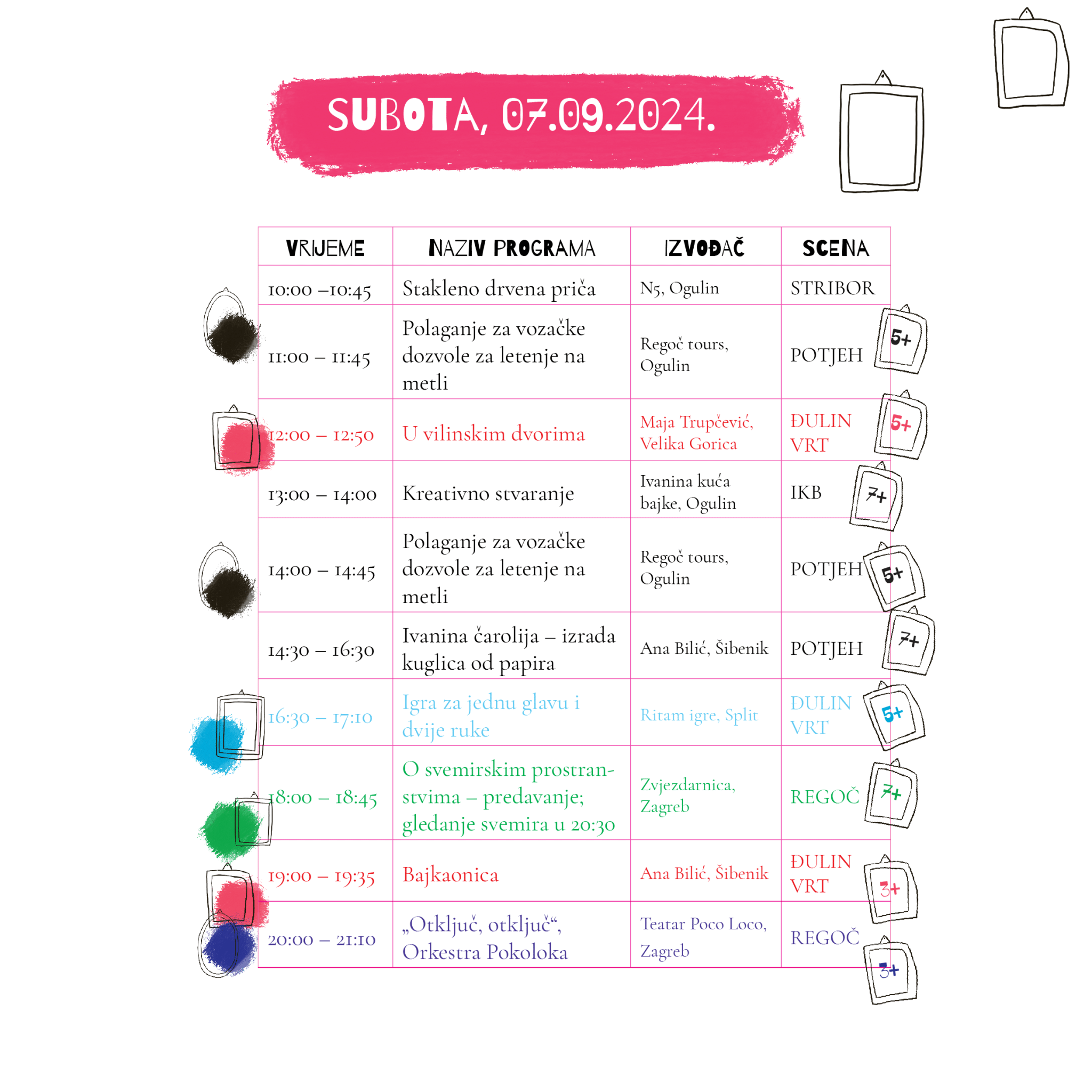 Festival se održava na četiri scene u Ogulinu, prigodno nazvanih po junacima bajki Ivane Brlić-Mažuranić. Kako ove godine obilježavamo 150. obljetnicu rođenja slavne hrvatske spisateljice, organizatori su se pobrinuli da njezin opus i neprocjenjivu ostavštinu proslavimo kroz niz zanimljivih događanja.