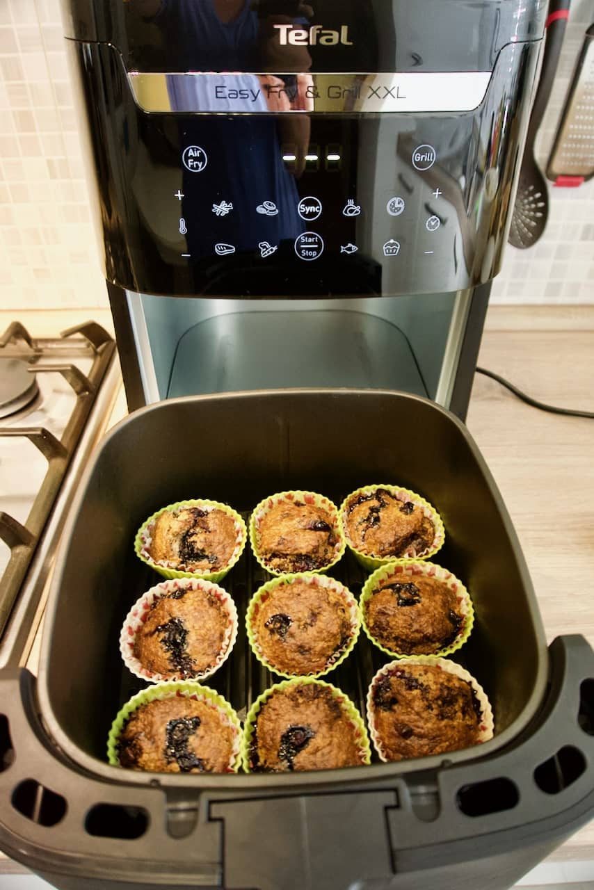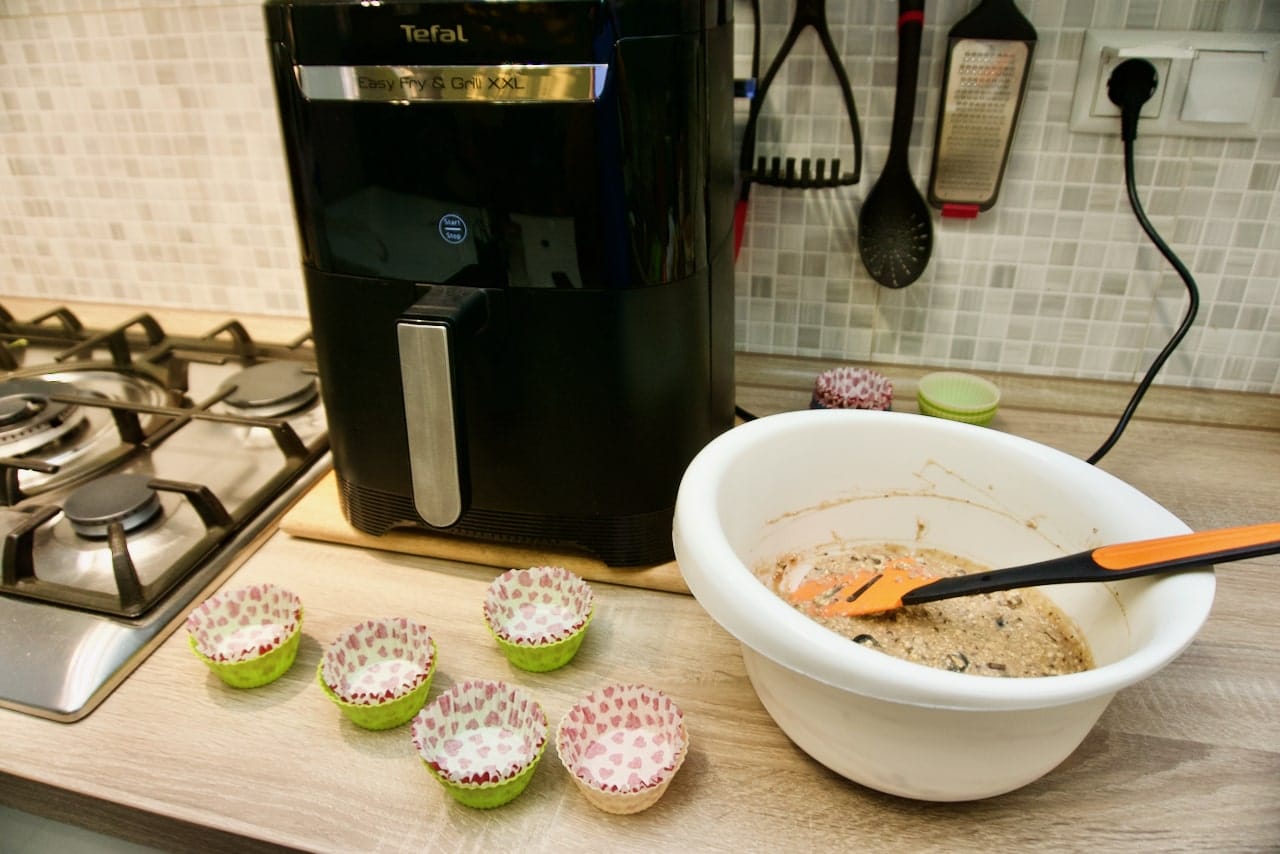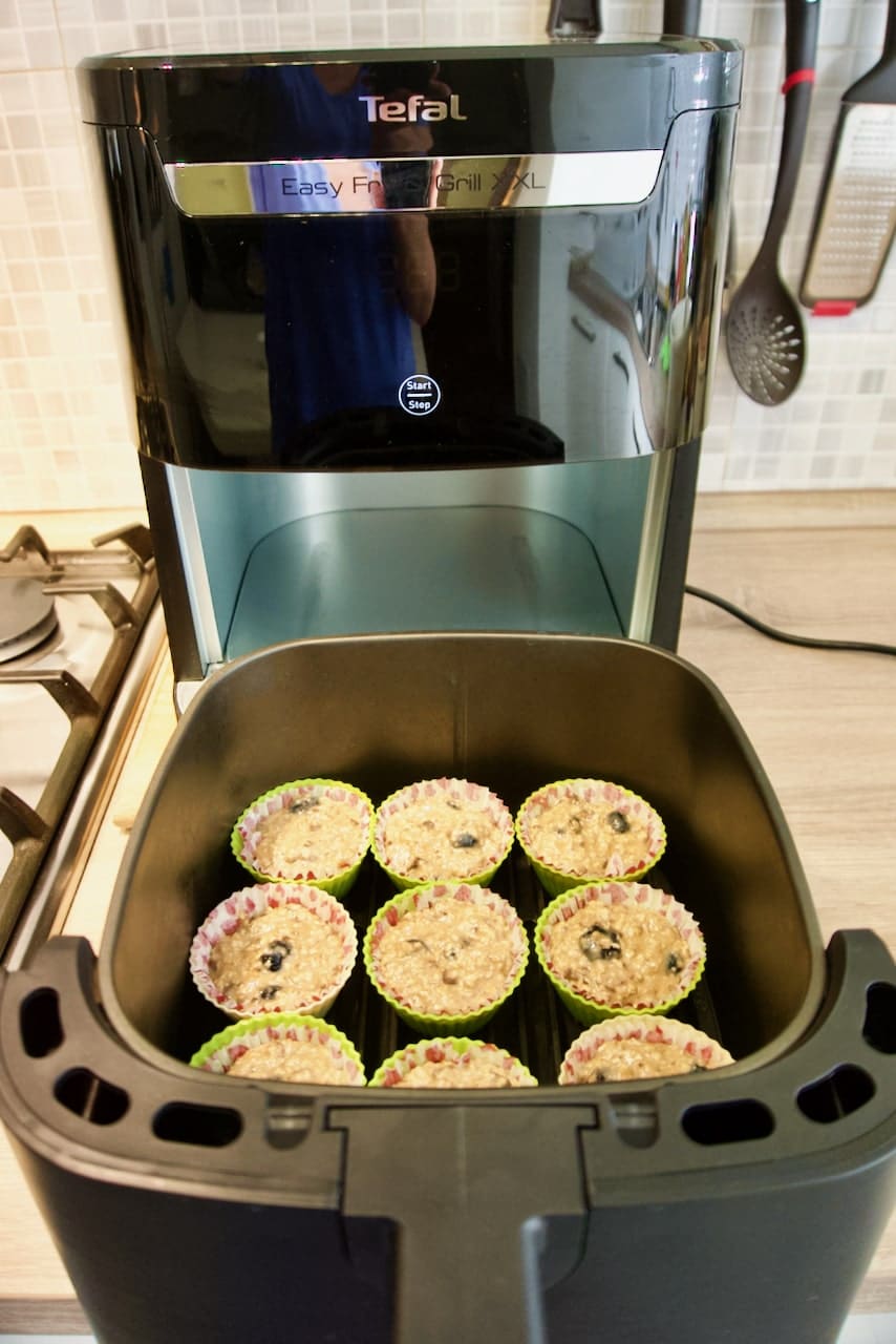 - Napuniti silikonske košarice za muffine skoro do vrha, složiti ih u košaru friteze i peći na funkciji deserta (180*, 18 min).