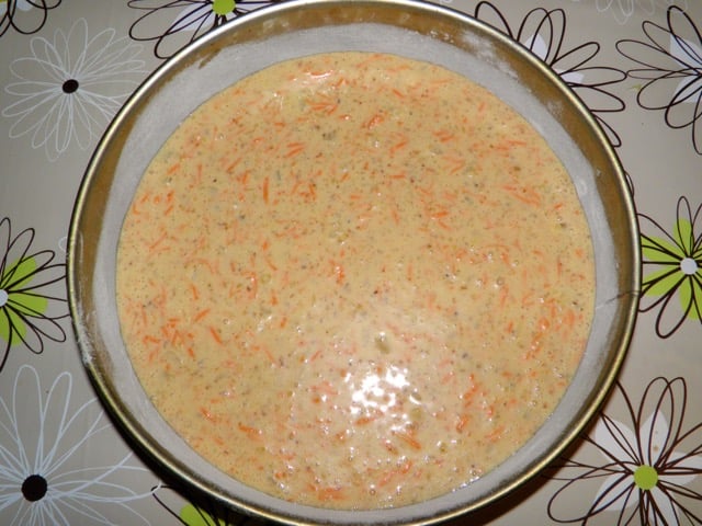 - Miksati jaja, šećer i vanilin šećer dok ne ppstanu pjenasta masa, potom uliti ulje pa izmiksati. Odmah zatim dodati ananas i mrkvicu. Na kraju postepeno umiješavati brašno, prašak za pecivo i na kraju mljevene orahe.