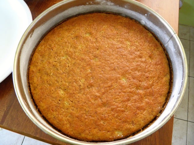- Izliti smjesu u kalup za tortu (25cmØ) koji ste prethodno namastili i pobrašnili. Poravnati i peći u pećnici prethodno zagrijanoj na 170°C 45 minuta. Sa hladnog biskvita, maknuti obruč.
