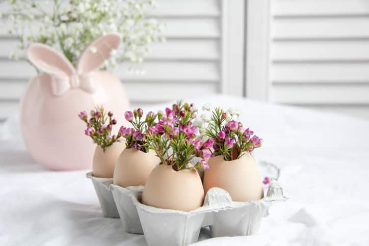 Operite karton od jaja pa odrežite oblik prema želji. Karton možete obojiti ili obložiti ukrasnim papirom ako želite. Otkrhnite samo vrh jaja, sadržaj spremite za izradu kolača, a ljusku pažljivo operite i osušite. Kad su ljuske od jaja suhe možete ih obojiti ili samo premazati uljem za sjaj izvana, a u unutrašnjost stavite blazinice koje ste navlažili vodom. Sada imate spremne majušne vaze za cvijeće. Ispunite ih buketićima sitnog poljskog cvijeća ili pupoljcima većeg rezanog cvijeća.