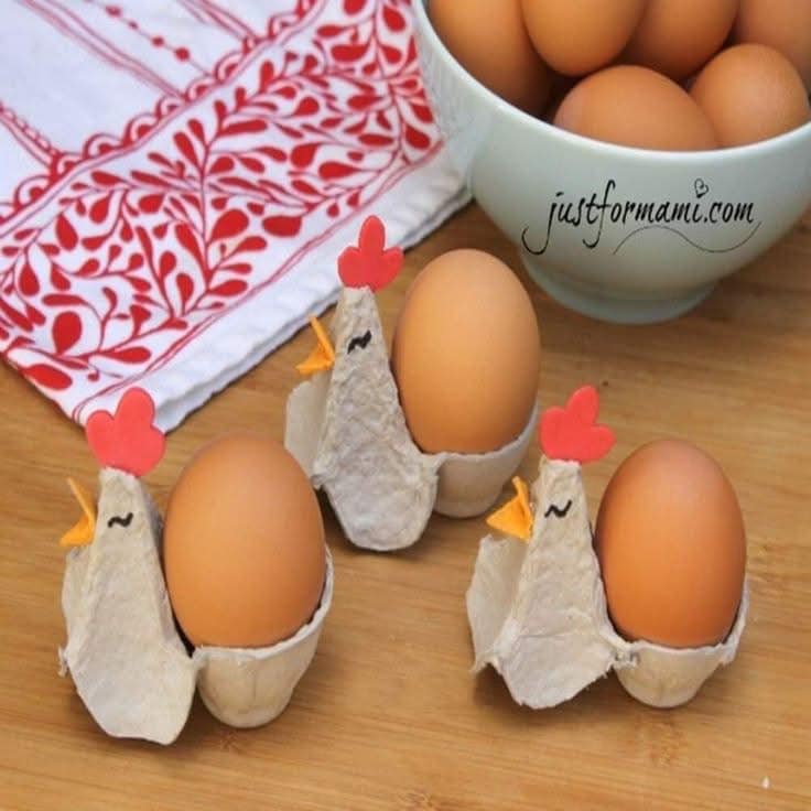 Izrežite kartone za jaja te od kolaž papira napravite krijestu i kljun. Oči možete nacrtati flomasterom. Ako imate perja i čistače za lule, možete se dodatno zabaviti. Uskršnje dekoracije sa kuhanim jajima možete staviti uz svaki tanjur