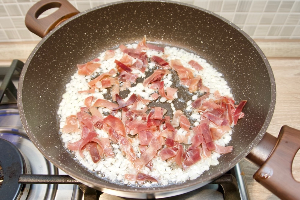 - Na malo ulja pržiti sitno sjeckani luk dok ne požuti. Dodati pršut isjeckan na komadiće, promiješati pa odmah dodati skuhanu tjesteninu. Preko tjestenine staviti kiselo vrhnje i majonezu, začiniti solju i paprom po želji pa dobro promiješiti kako bi se sastojci proželi. Tada dodati naribani sir pa opet promiješati. Sve ovo radite na stvarno tihoj vatrici tako dugo dok se sir ne otopi. Na kraju ubaciti i sjeckani vlasac.