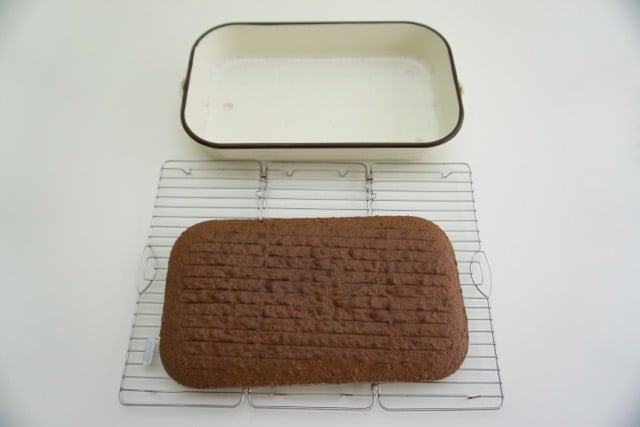 - Za biskvit miksati jaja sa šećerom, dodati ulje, brašno, kakao, čokoladu u prahu, prašak za pecivo i rum. Biskvitnu smjesu rasporediti u lim za pečenje srednje veličine. Stranice lima nauljiti i pobrašniti, a na dno staviti papir za pečenje kako bi se biskvit lakše iskrenuo iz lima nakon pečenja. Peći u pećnici na 180 C 30 min. Još topli biskvit iskrenuti iz lima, ohladiti i prerezati na pola. Jedan dio biskvita će biti podloga, a drugi dio biskvita izmrvite rukama na što sitnije komadiće.