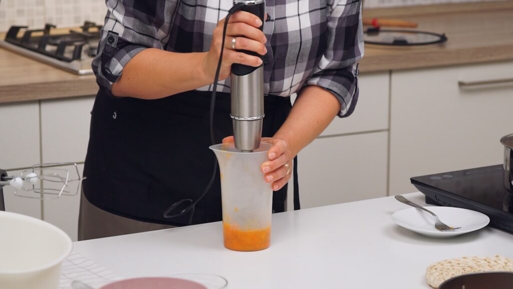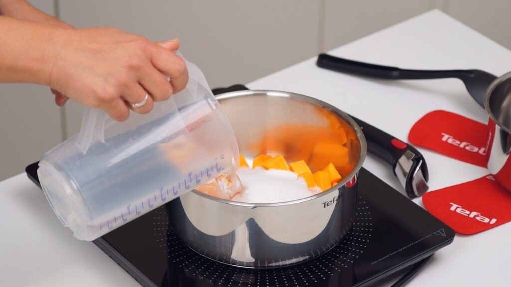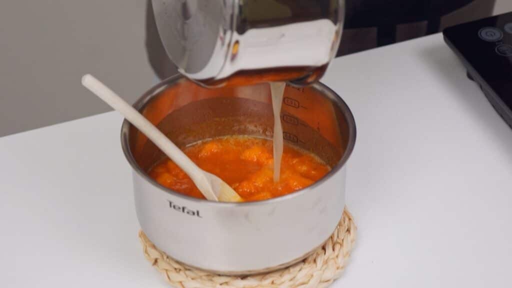 - Za kremu, staviti kuhati narezanu bundevu sa vodom i 200 g šećera. Kuhati tako dugo dok bundeva ne omekša. Tada ju izvaditi na stranu, polovicu bundeva zgnječiti, a ostalo ostaviti po strani. Vodu koja je ostala iza bundeva nastaviti kuhati na tihoj vatri još nekih 5 minuta dok se malo ne zgusne.