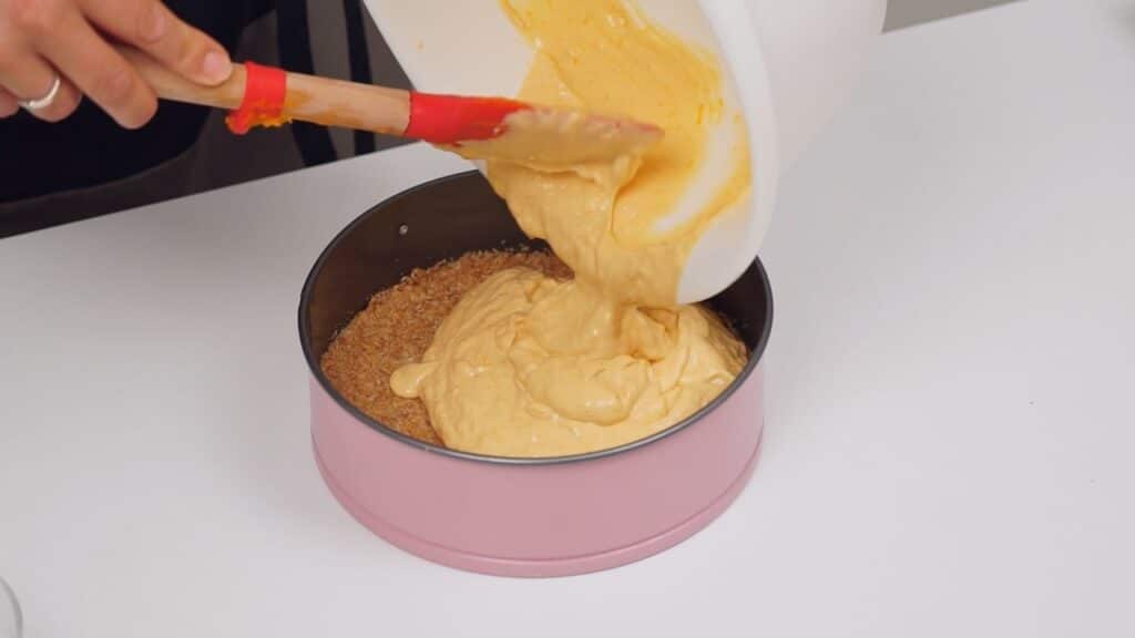 - Za preljev najprije želatinu promiješati za 4 žlice vode i ostaviti da nabubtri. Tada ju zagrijati i otopiti. Pomiješati ostatak bundeva i tekućinu u kojoj su se kuhale pa uliti želatinu i dobro promiješati. Ovako pripremljenim preljevom preliti prohlađeni cheesecake. Ostaviti prvo na sobnoj temperaturi, a potom u hladnjaku par sati da se potpuno ohladi i stisne. Tek tada maknuti obruč i poslužiti rezano na šnite.