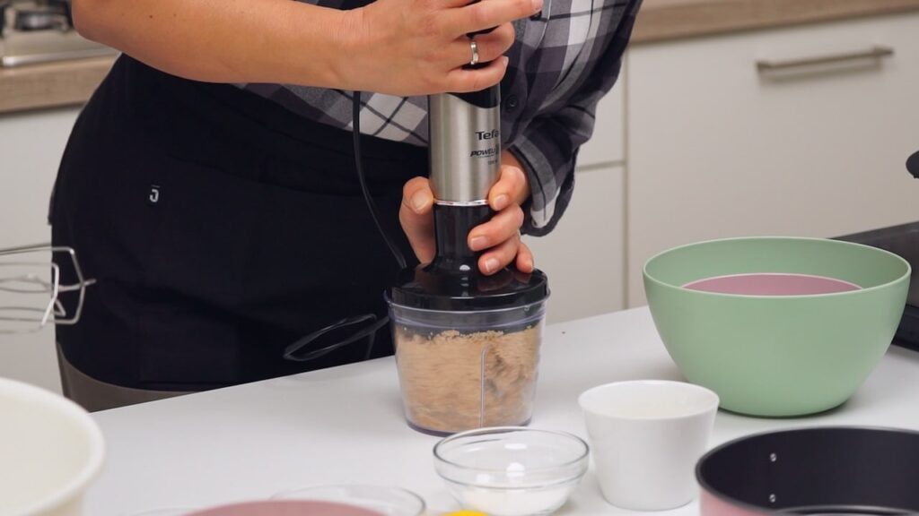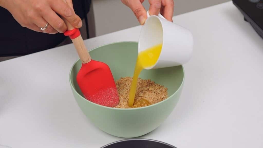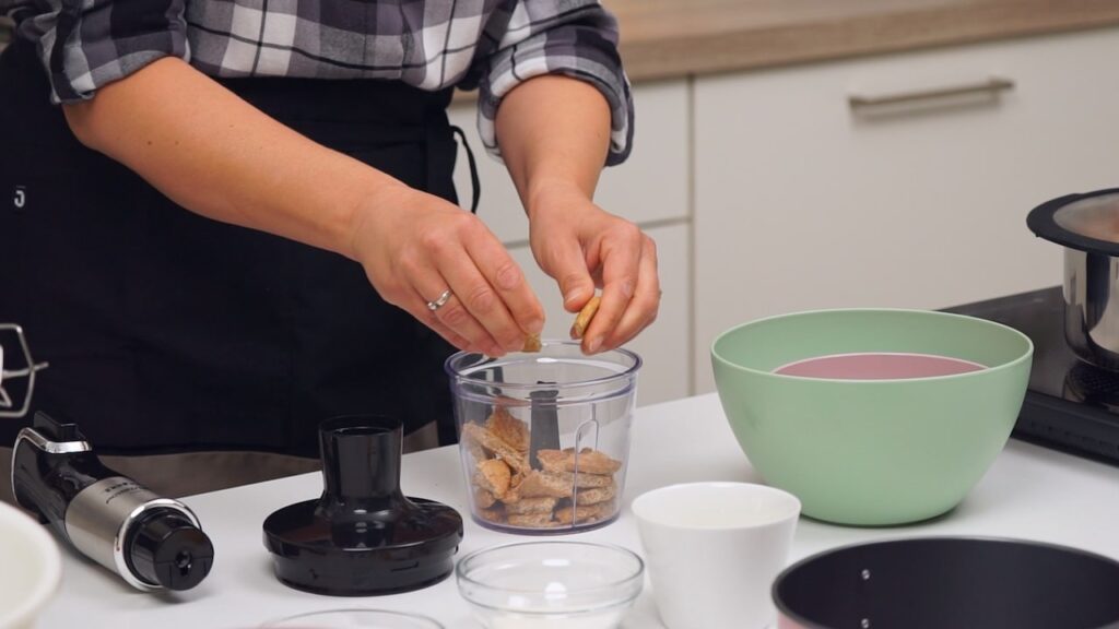 - Za podlogu usitniti kekse. Pomiješati kekse sa otopljenim maslacem i šećerom i dobro sjediniti. Utiskati podlogu u dno kalupa za torte promjera 20 cm.