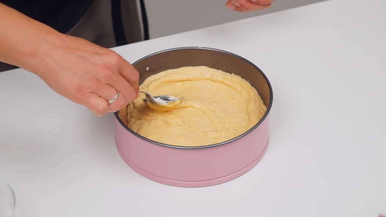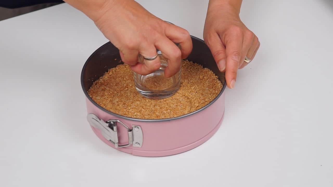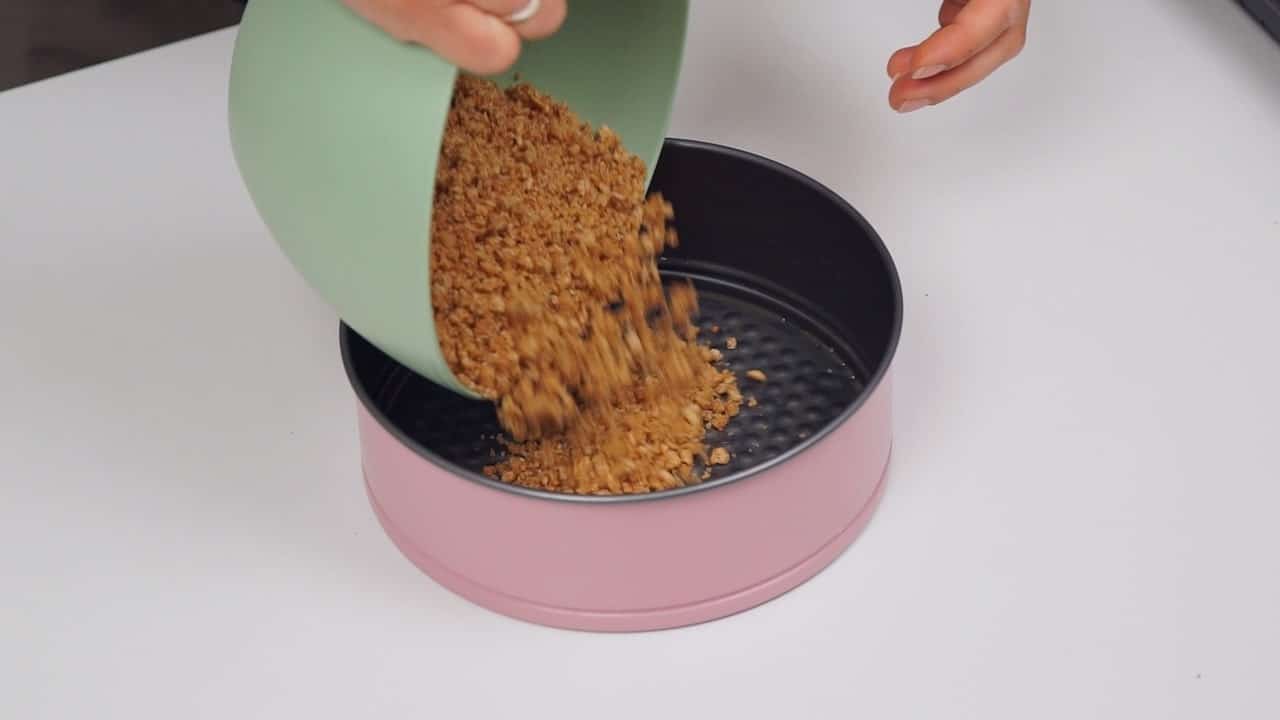 - Za podlogu usitniti kekse. Pomiješati kekse sa otopljenim maslacem i šećerom i dobro sjediniti. Utiskati podlogu u dno kalupa za torte promjera 20 cm.