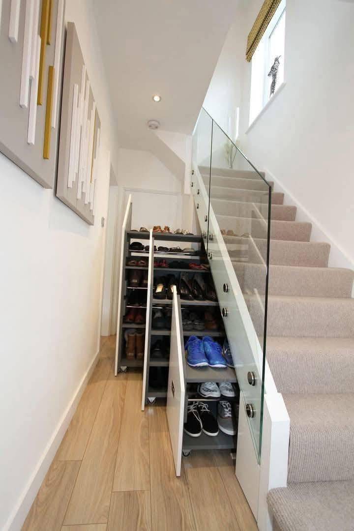 U stanovima je najbolje ispod stepenica stvoriti dodatni prostor za odlaganje u vidu ormara, polica ili vješalica za odjeću. Na fotografijama možete vidjeti kako smo u boravku jednog stana osmislili da se ispod nižih stepenica ormarići na kotačiće izvlače van.
