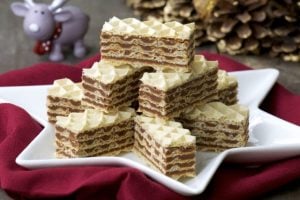 - Svaki komad oblatne premazujte sa otprilike 6-7 žlica kreme i pokrivajte slijedećim komadom oblatne. Kada ste završili, opteretite oblatne većim limom i pokojom knjigom kako bi se nadjev dobro zalijepio za oblatne i kako se ne bi razdvajalo nakon hlađenja i sušenja.