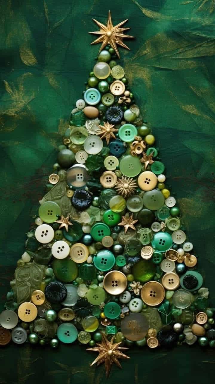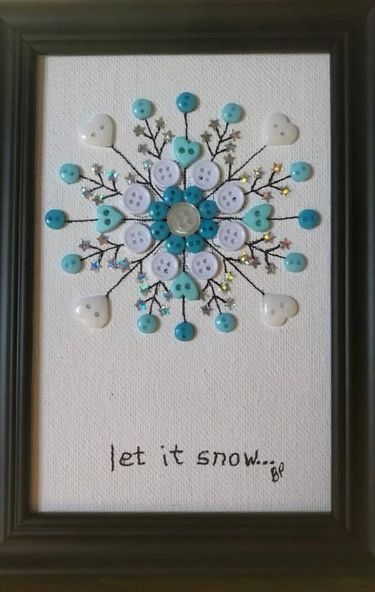 Platno pričvrstite za okvir slike i pokažite djeci kako prošiti detalje. Za početak nije važna apsolutna preciznost. Vježbom će doći i do toga. Odaberite jednostavne oblike (trokut za bor, kuglicu ili pahulju). Gumbiće mogu prišiti ili zalijepiti. Na kraju staklo možete vratiti, da štiti od prašine.