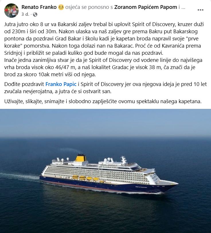 Kako jedinstveni posjet kruzera pod vodstvom kapetana Franka Papića nitko ne bi propustio, Bakarčanin Renato Franko je dan prije objavio: