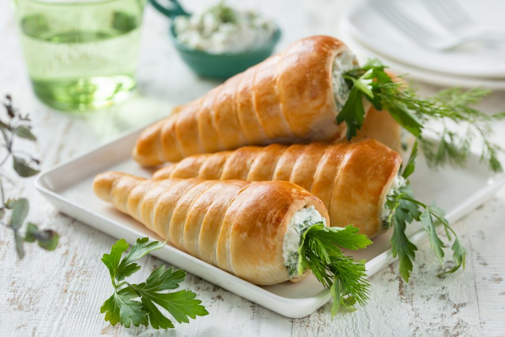 Ako imate metalne tuljce za pečenje kolača, obmotajte ih lisnatim tijestom. Nakon pečenja ih ostavite da se ohlade. Izvucite tuljce te ih ispunite slanim nadjevom.