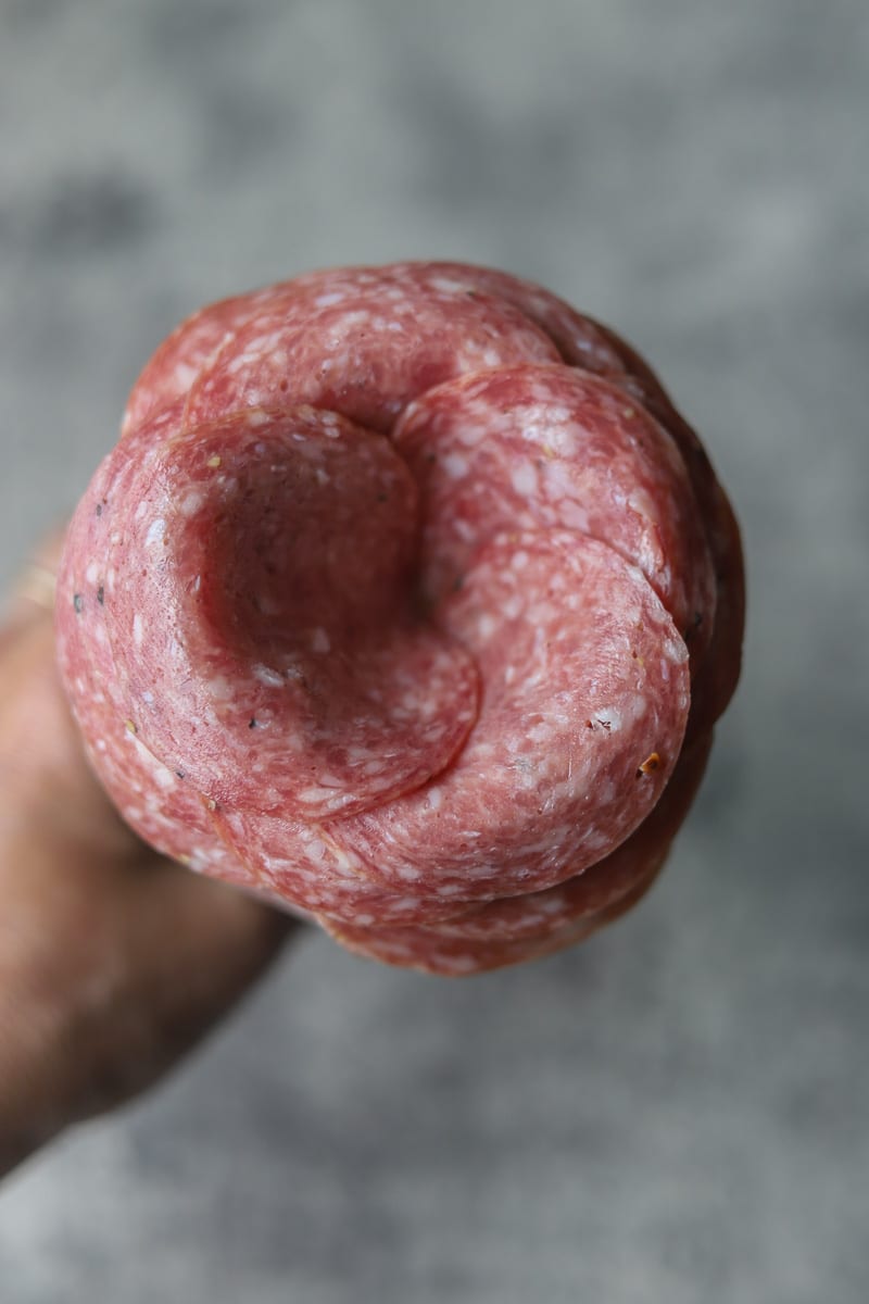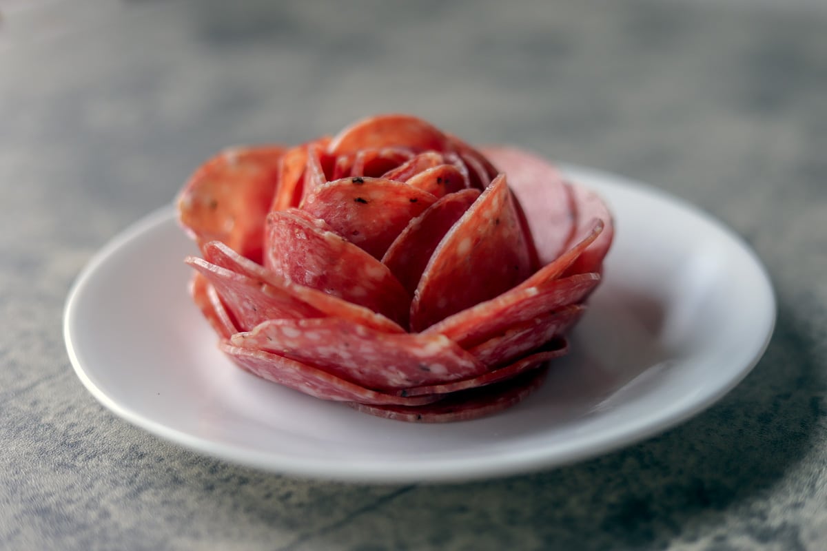 Na fotografijama je prikaz izrade ruža od salame, korak po korak. Na isti način možete napraviti ruže od polutvrdog sira (Gauda, Tilzit, Ementaler)