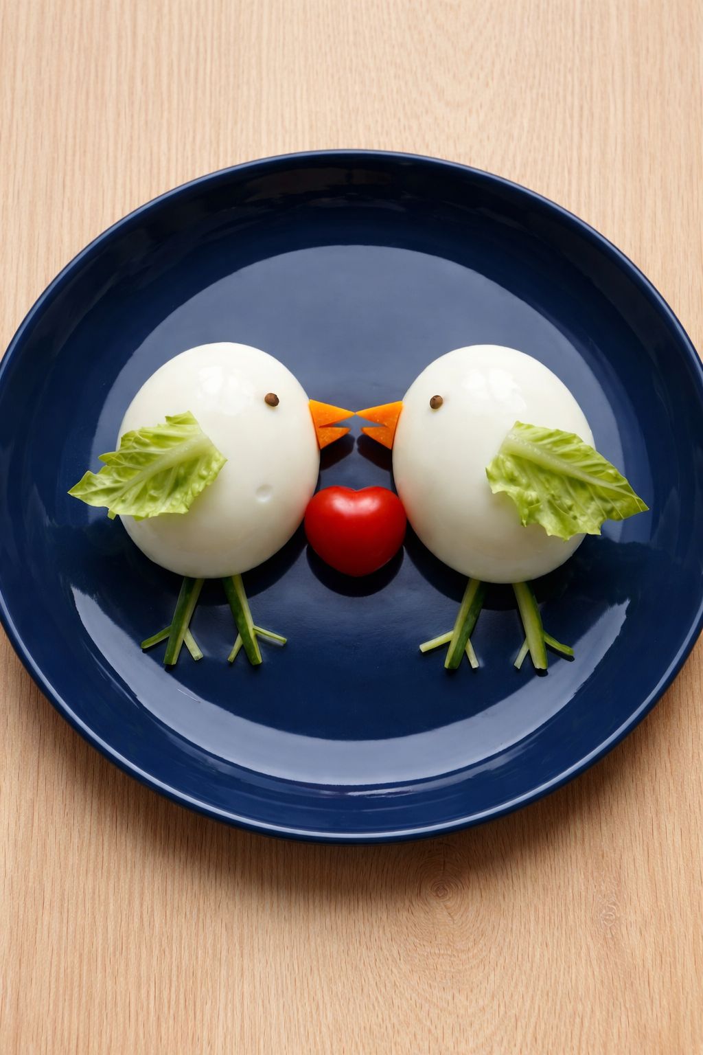 Glavu patke (cijelo jaje) možete učvrstiti štapićem za ražnjiće ili čačkalice (ako vam se čini nestabilnom). Za kljun izrežite mrkvu, za oči koristite kuglice papra.