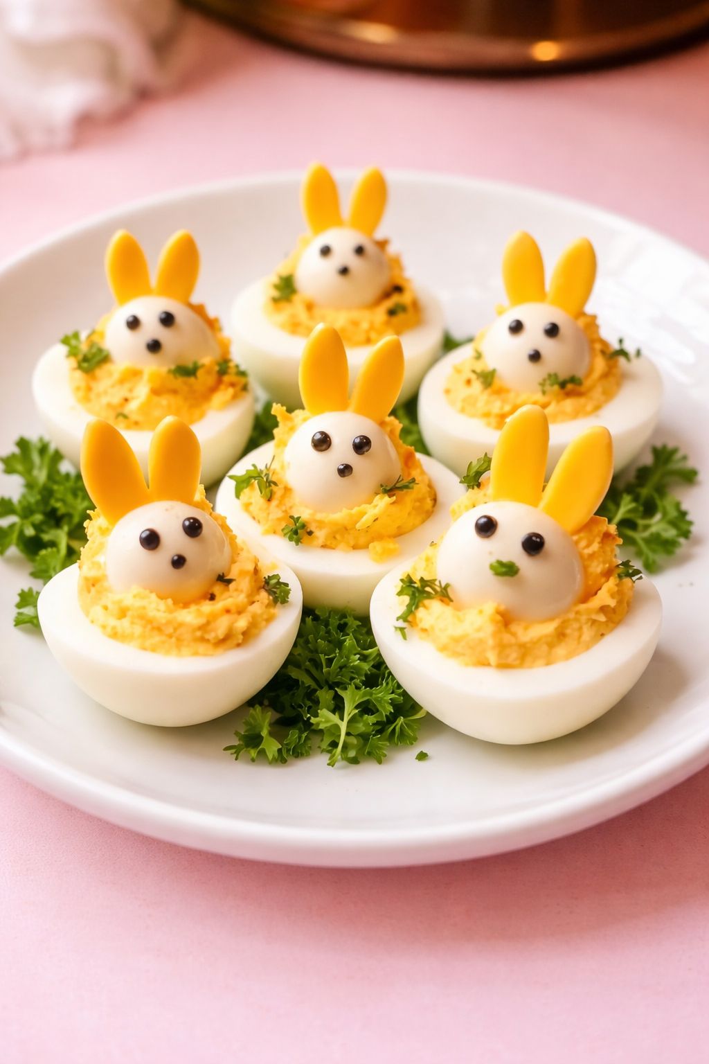 Uskršnji doručak uz jaja i povrće, na malo drugačiji način. Detalji poput očiju, njuškica ili uši rade se od zrna papra, izrezanog sira ili mrkve.