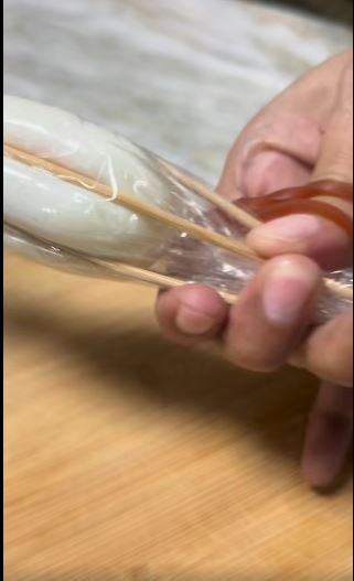 Učvrstite gumicom i lagano stisnite vrhove štapića s obje strane. Nemojte presnažno stiskati da bjelanjak ne popuca.