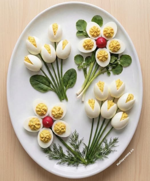 Ukoliko želite tulipane od punjenih jaja, nemojte bjelanjak rezati na četiri dijela (kao na prvoj fotografiji) već samo na dva (kao na zadnjoj fotografiji). Nadjev za punjena jaja je kremastiji, pa ćete pomoću bjelanjka zadržati pravu formu.