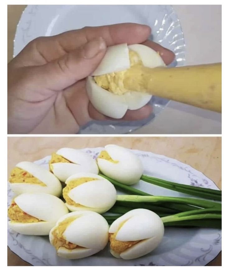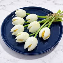 Ukoliko želite tulipane od punjenih jaja, nemojte bjelanjak rezati na četiri dijela (kao na prvoj fotografiji) već samo na dva (kao na zadnjoj fotografiji). Nadjev za punjena jaja je kremastiji, pa ćete pomoću bjelanjka zadržati pravu formu.