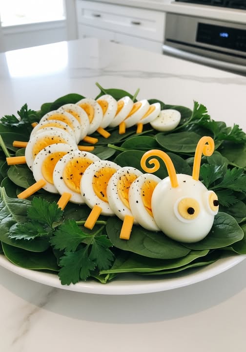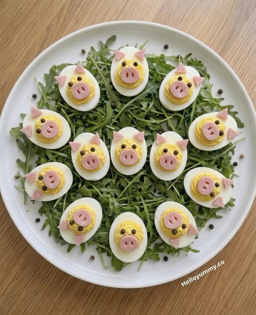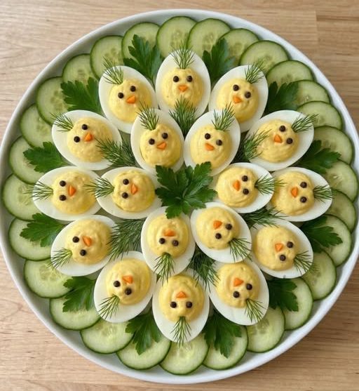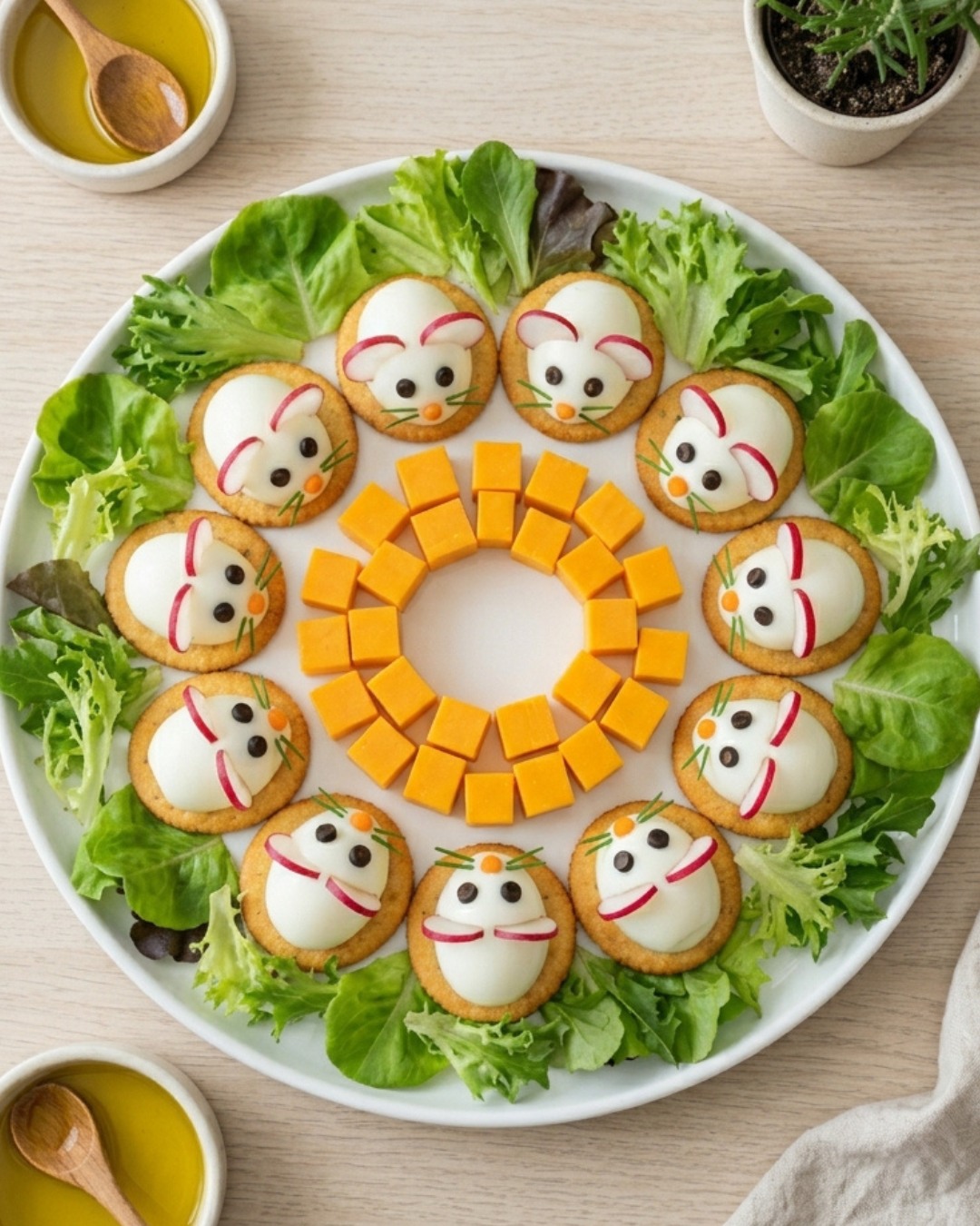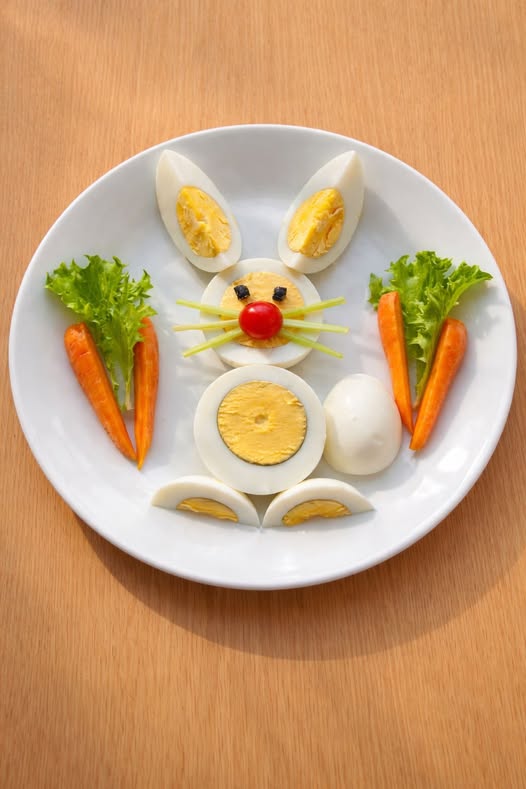 Uskršnji doručak uz jaja i povrće, na malo drugačiji način. Detalji poput očiju, njuškica ili uši rade se od zrna papra, izrezanog sira ili mrkve.