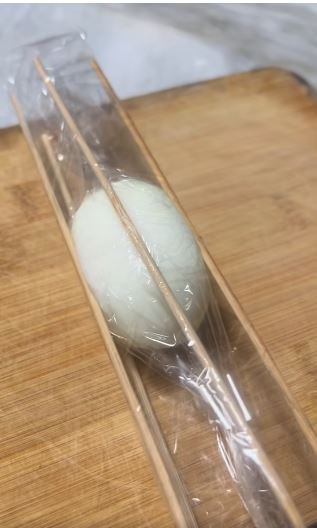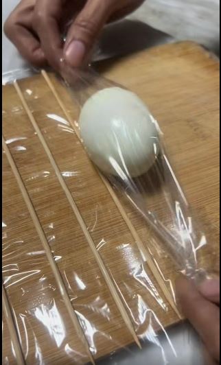 Tvrdo kuhano jaje umotajte na početku folije pa presavijajte do kraja (preko štapića).