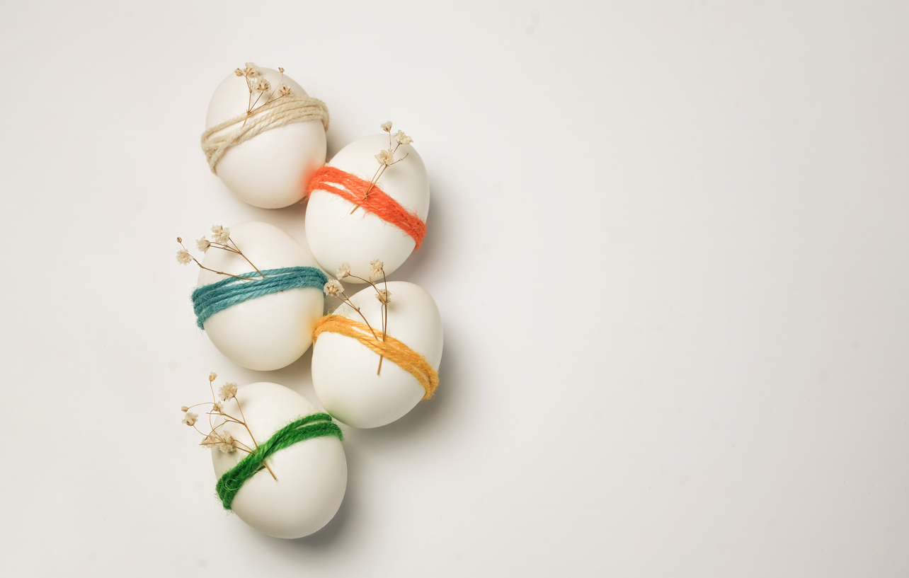 Jaja možete obojati pa ih ukrasiti grančicom, cvijetom, žicom, koncem ili flomasterom. Možete ih ostaviti u prirodnoj boji i samo ukrasiti.