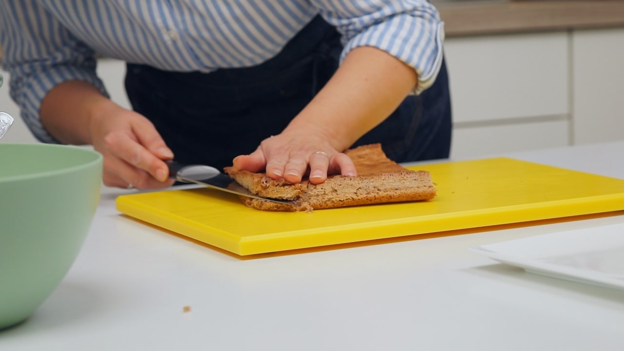 - Ukoliko slažete kolač biskvit prerežite vodoravno na dva dijela da dobijete dvije kore. Na donju koru složiti jabuke, preko jabuka polovicu kreme. Poklopiti drugom korom i premazati ostatkom kreme. Po želji posipati krokantom ili bademima u listićima i rashladiti prije rezanja na kocke.
