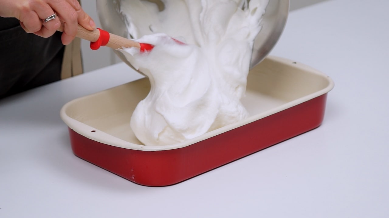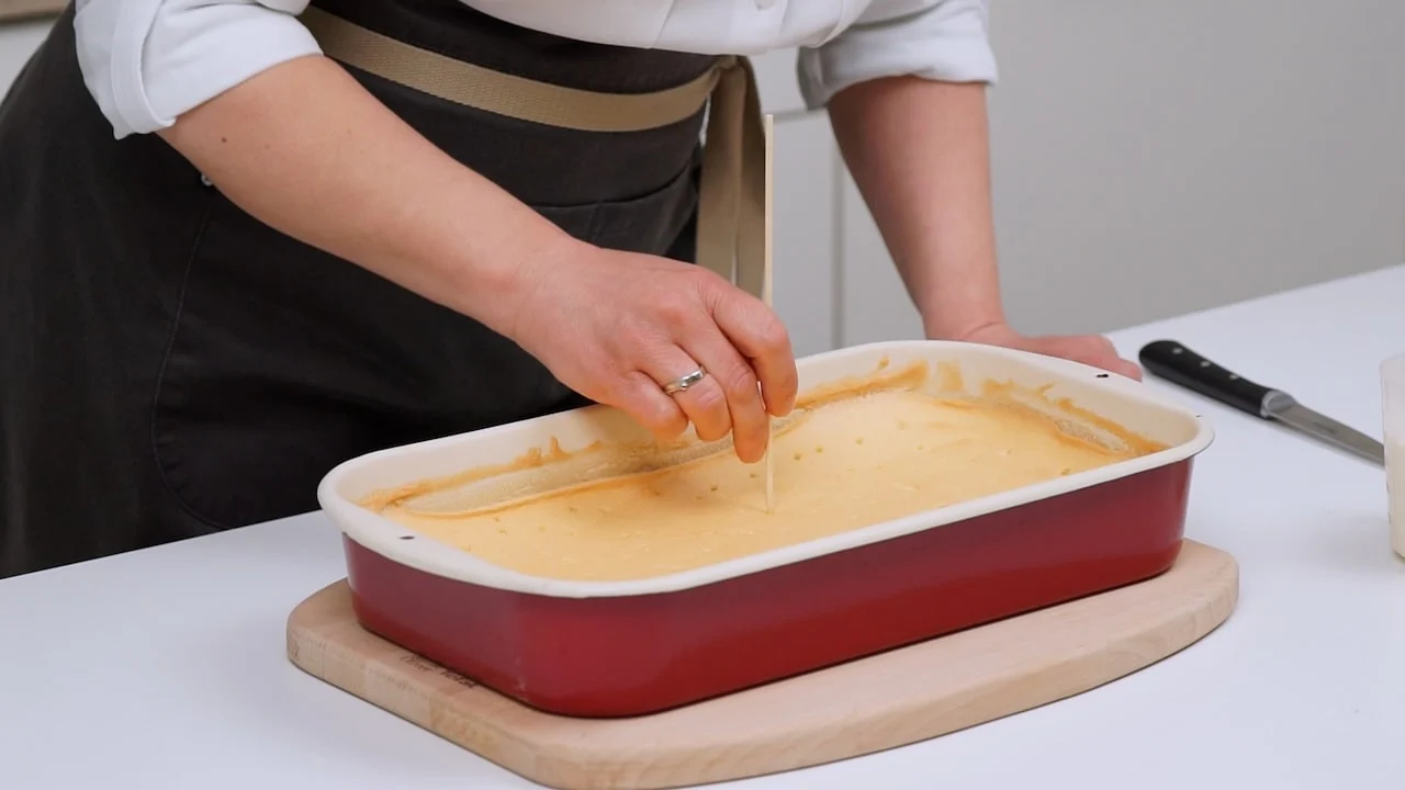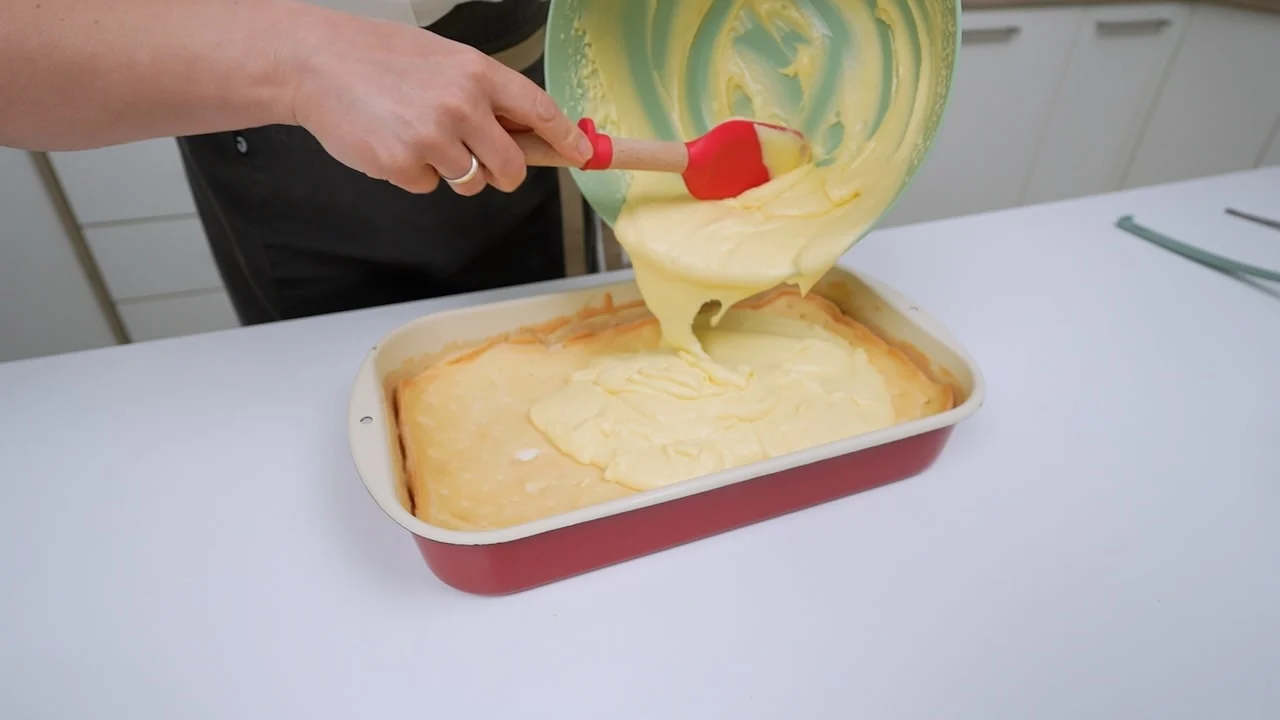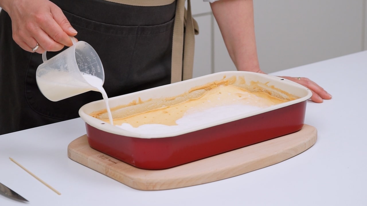 - Za biskvit miksati bjelanjke dok ne postanu čvrsti snijeg. Tada postepeno dodavati šećer i miksati dok se sav šećer ne otopi i dok masa ne postane sjajna i čvrsta. Tek nakon toga pomalo dodavati brašno neprestano miksajući na maloj brzini. Ovako dobivenu biskvitnu smjesu razporediti u lim srednje veličine prethodno namašćen i pobrašnjen i poravnati. Peći u pećnici zagrijanoj na 180*C 20 minuta. Pečeni biskvit dok je još topao izbockati vilicom ili štapićem po cijeloj površini i zaliti toplim mlijekom. Ostaviti po strani da se potpuno upije i ohladi.