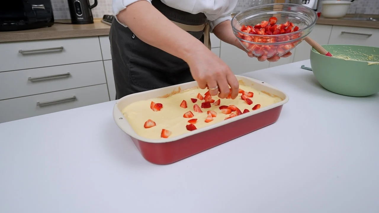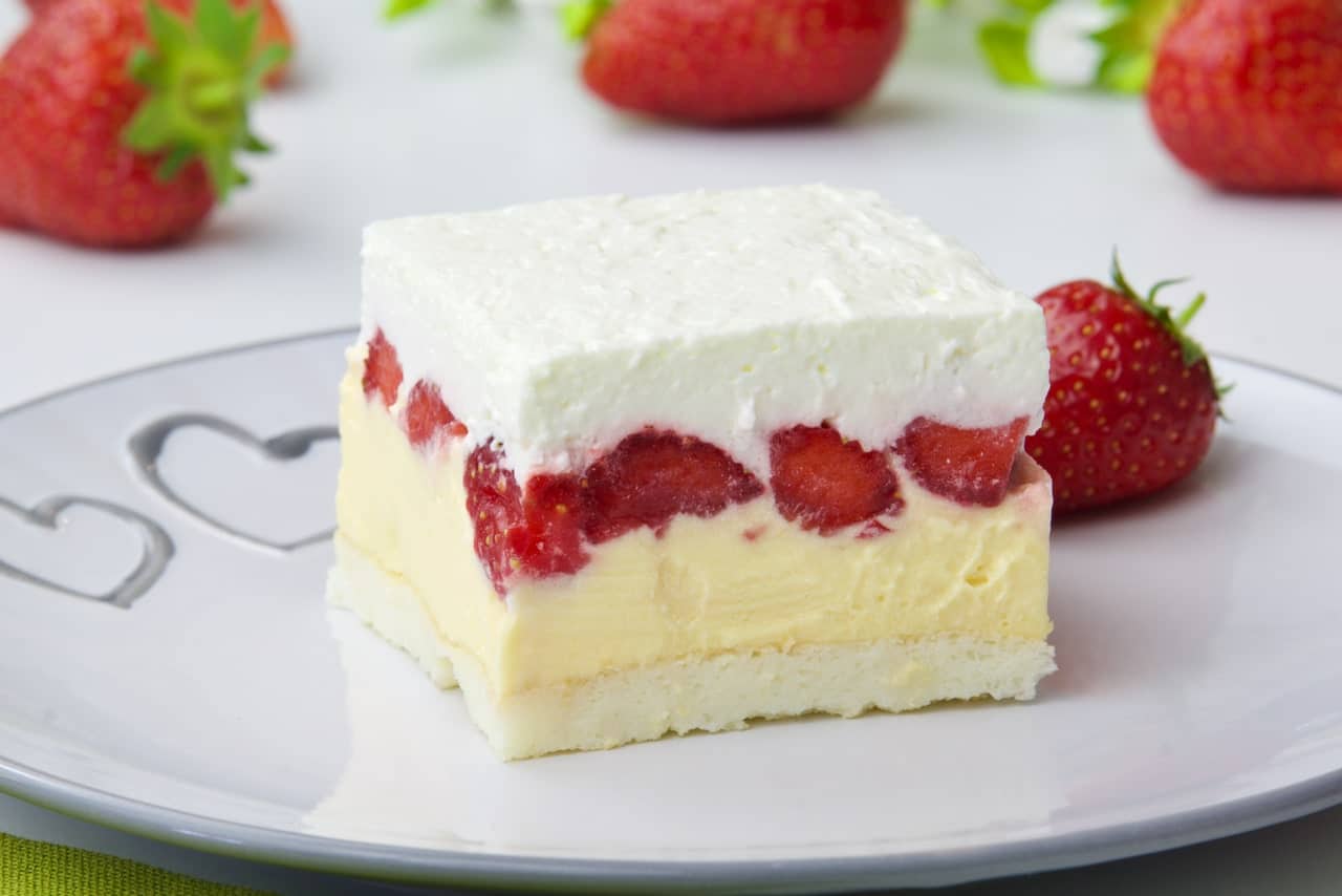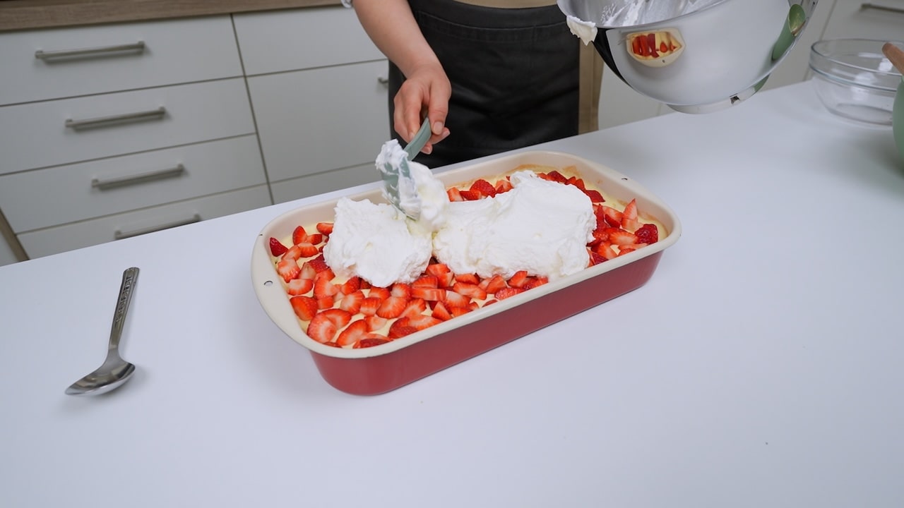 - Na ohlađeni biskvit rasporediti kremu, preko kreme složiti nasjeckane jagode, a preko svega staviti slatko vrhnje ulupano u čvrsti šlag. Kolač dobro rashladiti i poslužiti rezan na kocke.