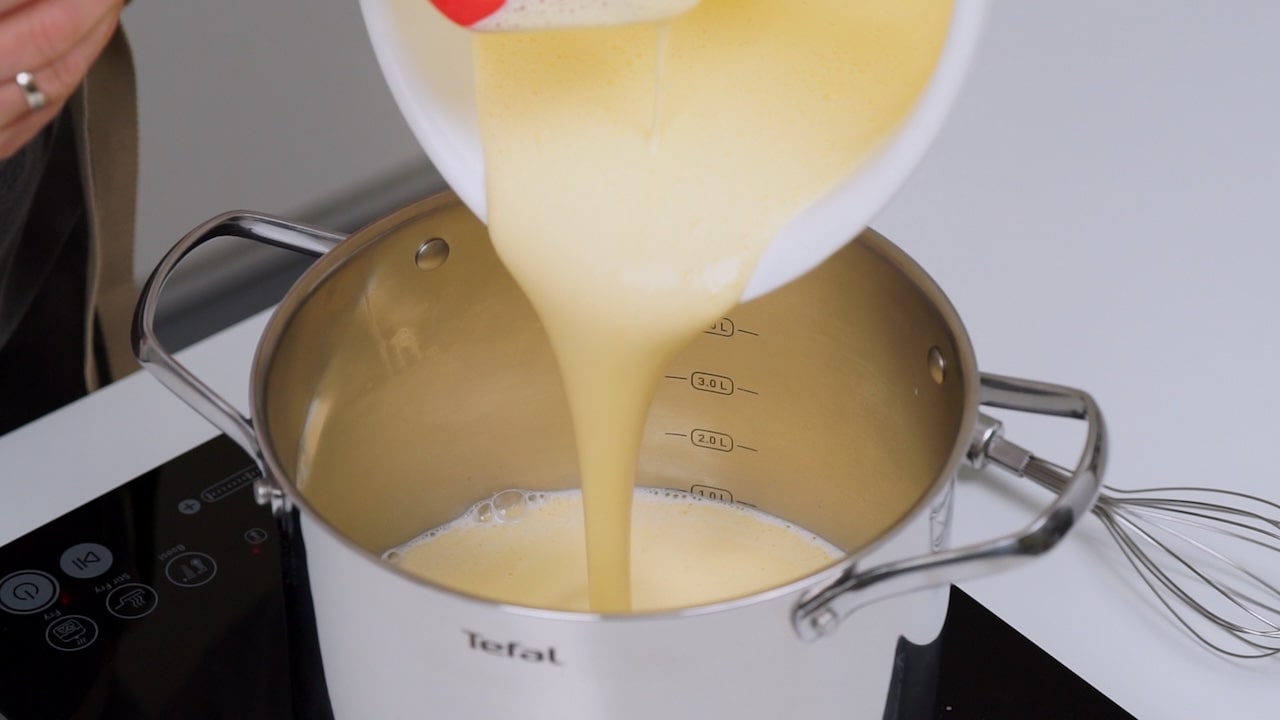 - Za kremu staviti u veću posudu mlijeko da se polako zagrijava. Manji dio mlijeka ostaviti po strani. Miksati žumanjke sa šećerom i vanilin šećerom, potom dodati brašno i onaj manji dio mlijeka. Ukuhati sve u preostalo kipuće mlijeko i kuhati par minuta uz miješanje dok se lijepo ne zgusne. Ohladiti uz miješanje.